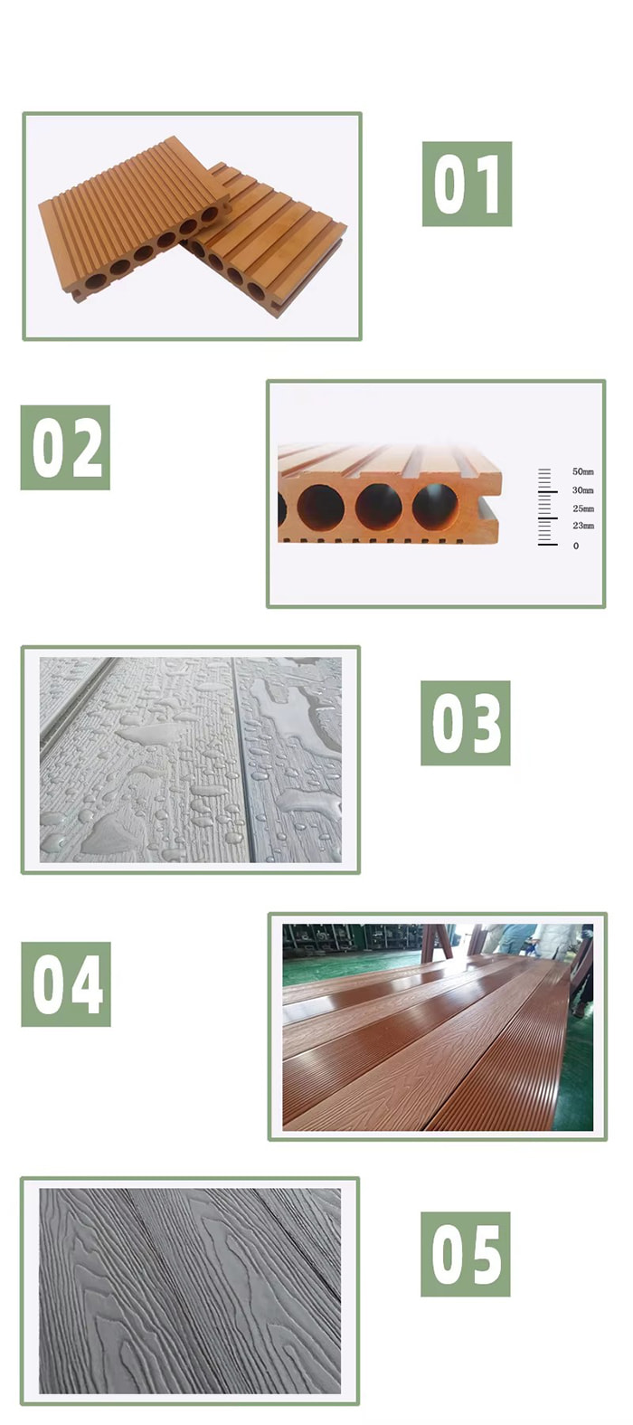 Päätuotteitamme ovat: PVC-kattopaneelit, PVC-seinäpaneelit, WPC-seinäpaneelit, kuumaleimauskalvot, PVC-laminointikalvot, SPC-lattiat, WPC-terassit ja muut niihin liittyvät tuotteet. Vuosittainen myyntimme voi nousta jopa 35 miljoonaan USD.