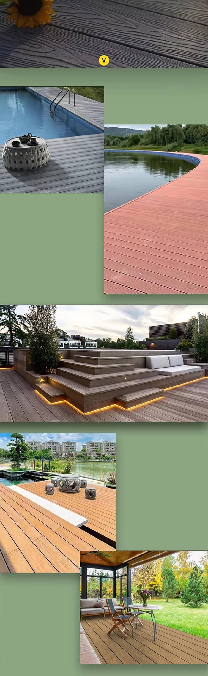 Yleiset tilat: Kouluissa, sairaaloissa, liikuntasaleissa ja muissa paikoissa voidaan käyttää helposti puhdistettavia, bakteereja estäviä ja liukastumista estäviä WPC-lattiapäällysteitä, jotka auttavat ylläpitämään näiden paikkojen turvallisuutta ja sanitaatiota.