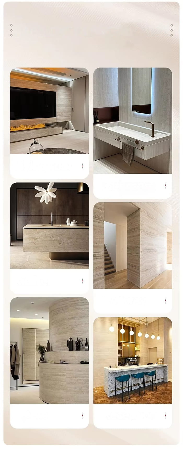 Sisäseinien rakentaminen: Voidaan käyttää asuntojen, toimistojen, hotellien, ostoskeskusten, koulujen, sairaaloiden, toimistorakennusten, huviloiden, huippuluokan yhteisöjen jne., kuten taustaseinien, keittiöiden, kylpyhuoneiden ja muiden tilojen sisäseinien sisustamiseen.